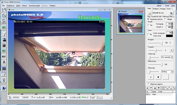 IP kamera képet is beilleszthetünk a Photo NEWS III képújságba. ( A korábbi verziókban is lehetőség volt élőképet berakni, de csak a gépben elhelyezett capture (rögzítő) eszközökről.) A legújabb fejlesztéssel most már a képújság MPEG4 streames IP kamerákat is tud fogadni. A videó objektumnál a link ikonra kattintva, megadható az IP kamera útvonala (IP címe, jelszó stb.)
